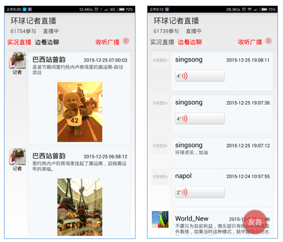 其中最具特色的直播互动栏目支持小视频、图文、音频的实时直播,直播同时互联网用户可实时通过发言参与直播节目互动,互动支持语音、文字、图片等多内容。实现了边看直播视频、边听音频、边互动的媒体融合应用。改版后的环球资讯广播将进一步将移动人群作为核心用户,面向全方位、高影响力受众,打造以国际资讯为核心的环球生活有声伙伴。