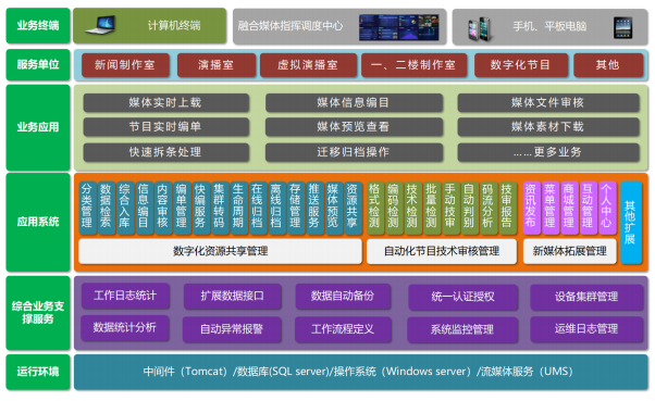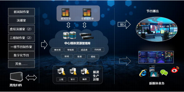 数字化资源共享管理系统基于音视频文件媒体、图片、文字等内容的全媒体管理方式可提供基于多个不同职能权限授权的汇聚、入库、编目、编排、转码、审核、检索、存储、归档、周期、版权、播出服务,同时具有灵活的扩展性,后期可支持 OTT、IPTV、APP、网站等各类新媒体内容应用平台,其涉及的业务流程是从内容节目源开始至应用系统调用的整个管理流程。