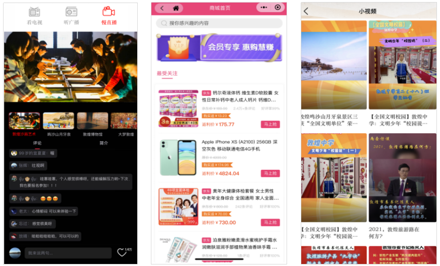 3、以互联网+为导向,增加文旅研学、招商引资、热点聚焦、政务服务、商城、慢直播、场外记者互动连线等个性服务。打造 “媒体+政务+服务+文化旅游”模式的敦煌特色融媒传播矩阵,传播矩阵成为干部群众第一时间了解敦煌大事小情,查询办理政务民生事项的“掌中宝”。