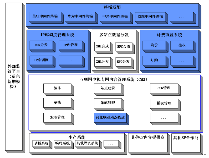 项目建设主要功能模块有:河北联通IPTV站点建设、运营商互联网电视专网CMS系统对接、河北联通IPTV站点模板建设、河北联通IPTV站点详情页播放器页面开发、河北联通IPTV前端搜索系统建设、河北联通IP库调度管理系统开发、河北联通计费前置系统开发、Linux终端适配开发。