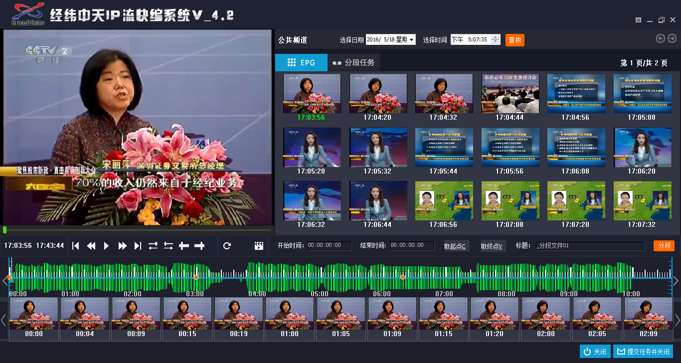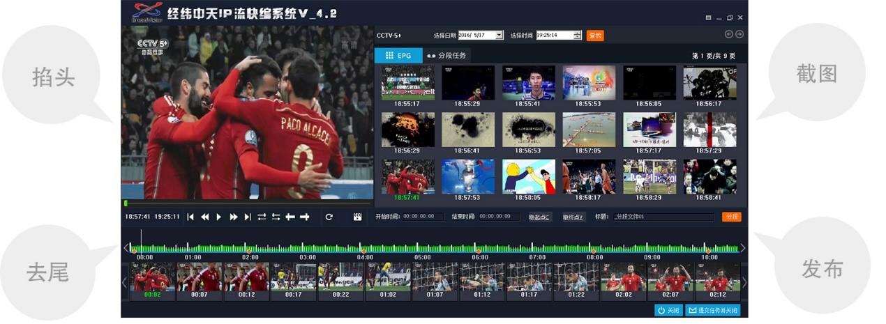 2、IP视频流内容的精编:支持对IP视频流内容精确到帧的精编操作,可实现快速拆条、物理分段。例如新闻节目其中存在很多条单独的新闻,通过快速拆条、编辑管理,即可在WEB管理界面迅速将其裁剪成各个单独的新闻片段,同时可对各片段进行编目管理并发布。