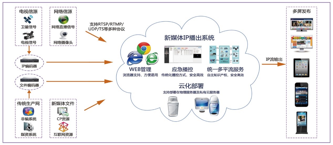 yp街机·电子游戏(中国)官方网站 IP流播控系统提供基于媒资库文件和IP流信号的自定义节目轮播组合与多频道管理,可针对台内传统播出系统、OTT、客户端APP、IPTV、网络电视台等不同媒体平台,提供多通道内容节目组织和输出服务,支持本地文件与IP信号的混合播出、延时播出和应急播出、支持节目间和节目内的任意广告插播、实现频道运营和广告创收,满足各类新媒体业务的自办频道建设需求,大大降低了新媒体自办频道的建设成本。