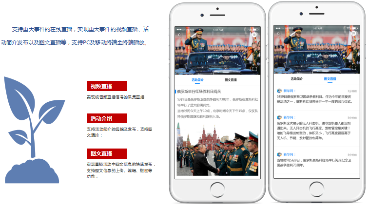 1、 一键发起直播,支持多种直播视频接入方案:通过手机客户端即可实现实时现场信号的采集、推流及直播互动;支持电脑推屏、直播一体机、直播盒子、5G 4K超高清直播背包等多种直播信号的接入。