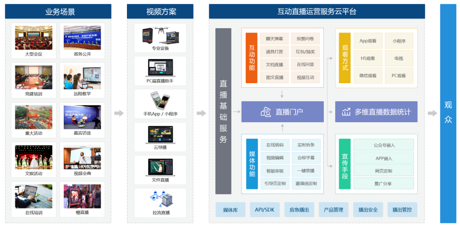 3、多业务应用场景:支持大型会议、政务公开、党建培训、嘉宾访谈、远程教学、重大活动、文娱活动、慢直播等多种业务场景。