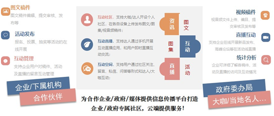 2.互动网络直播:为平台用户以及入驻单位提供在线互动直播服务,客户端提供实时拍摄与4G回传技术,可在现场实时发起基于现场报道、培训、庆典、会议等多种类型活动的直播,并配有点赞、评论、在线活动、内容审核等多种互动组件。